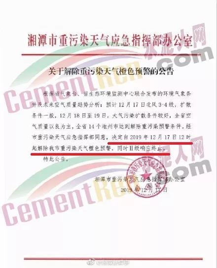12月17日,湘潭市重污染天氣應急指揮部辦公室發出《關于解除重污染天氣橙色預警的公告》,公告表明,決定自17日12時起 ,解除湘潭市重污染天氣橙色預警,同時II級響應終止。