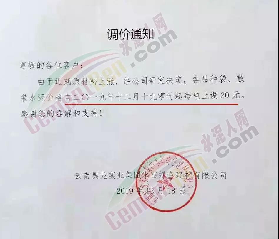 新一輪漲價開啟,西南區域四川、重慶、云南等多家水泥企業加入“漲價大軍”。其中云南昊龍實業集團水富綠色建材有限公司調價通知稱自今日(19日)零時起各品種袋、散裝水泥上調20元/噸。