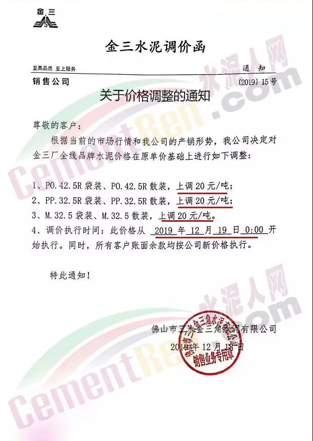 廣東區域,佛山金三水泥通知,根據當前的市場行情結合公司的產銷形勢,決定自今日(19日)0時起對金三廠全線品牌水泥在原單價基礎上上調20元/噸。