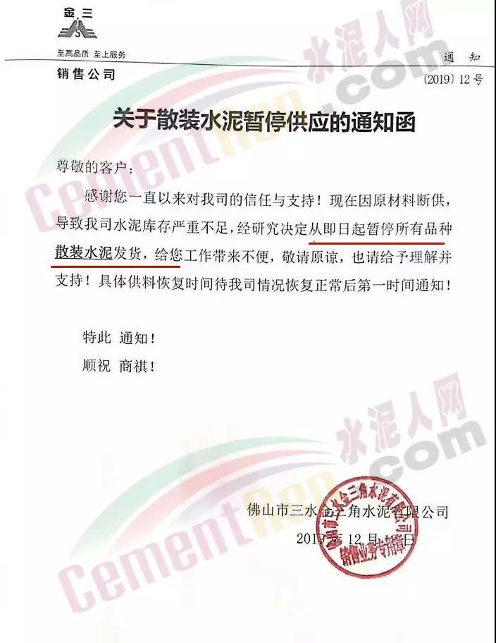 據了解,日前佛山市三水金三角水泥有限公司剛剛發布了散裝水泥停供通知。通知稱,因原材料斷供、導致公司水泥庫存嚴重不足,經研究決定從即日起暫停所有品種散裝水泥。具體供料恢復時間等企業情況恢復正常后第一時間通知。