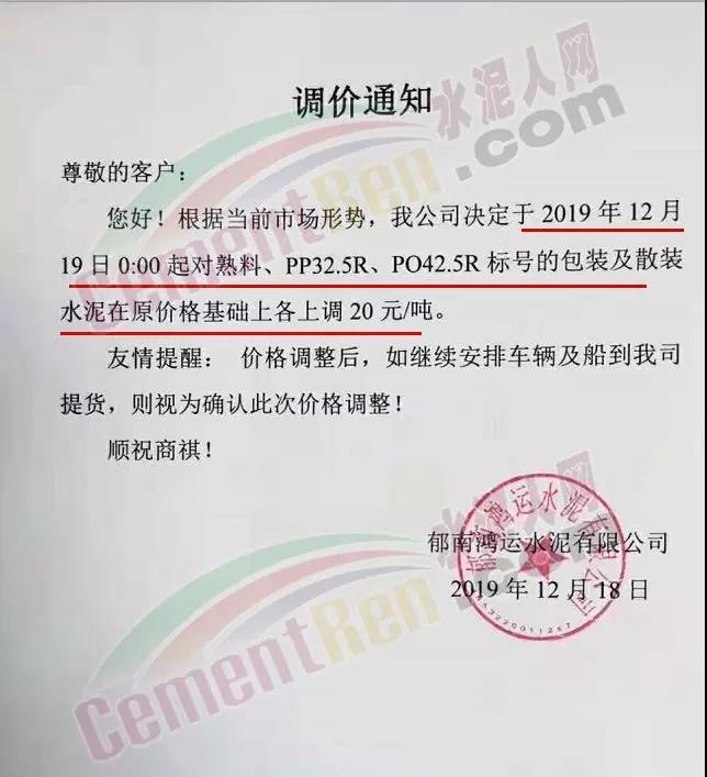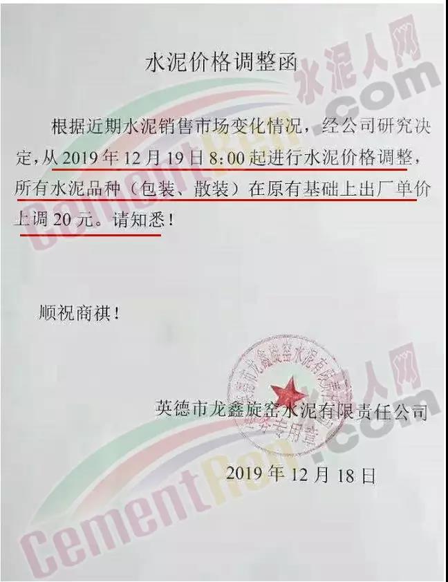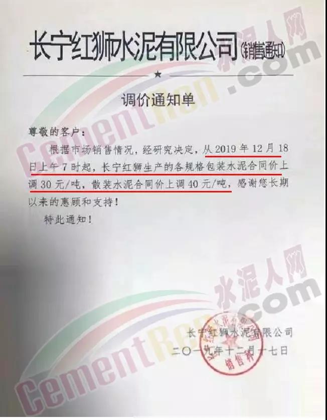 排隊船昨日(18日),四川區域各企業也通知上調水泥格30-40元/噸。其中長寧紅獅水泥調價通知稱,根據市場銷售情況,經研究決定 從12月18日上午7時起,長寧紅獅生產的各規格包裝水泥合同價上調30元/噸,散裝水泥合同價上調40元/噸。