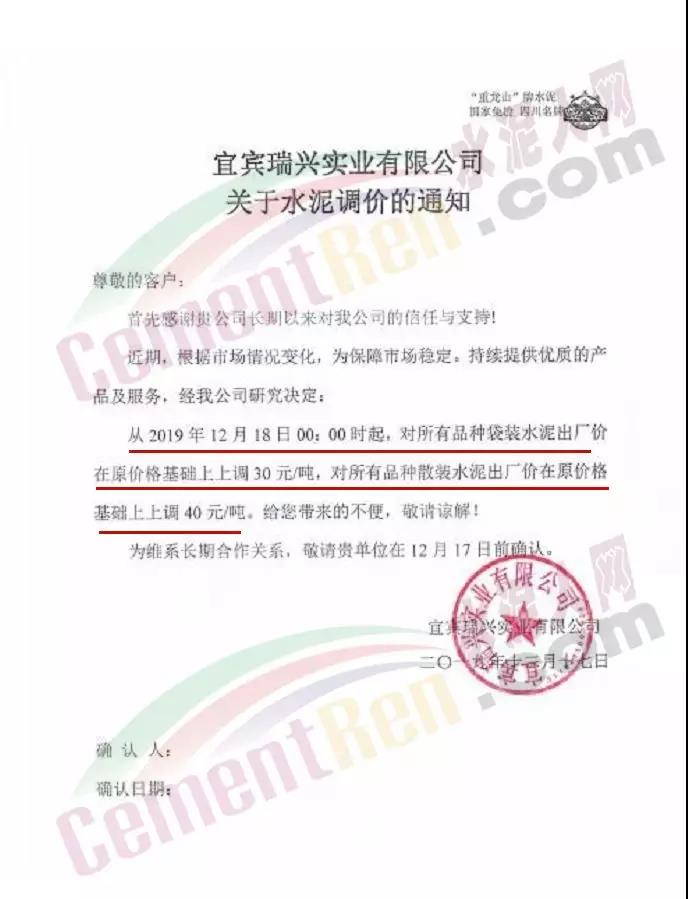 宜賓瑞興實業有限公司調價通知稱自18日0時起,對所有袋裝水泥出廠價上調30元/噸,,所有散裝水泥出廠價上調40元/噸。