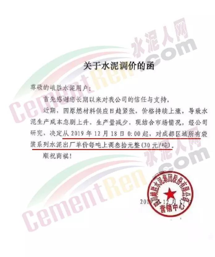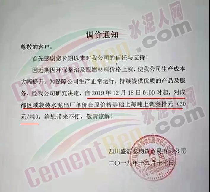 四川盛浩泰物資貿易有限公司調價通知稱,自12月18日零時起,對成都區域袋裝水泥出廠單價在原價格基礎上上調30元/噸。