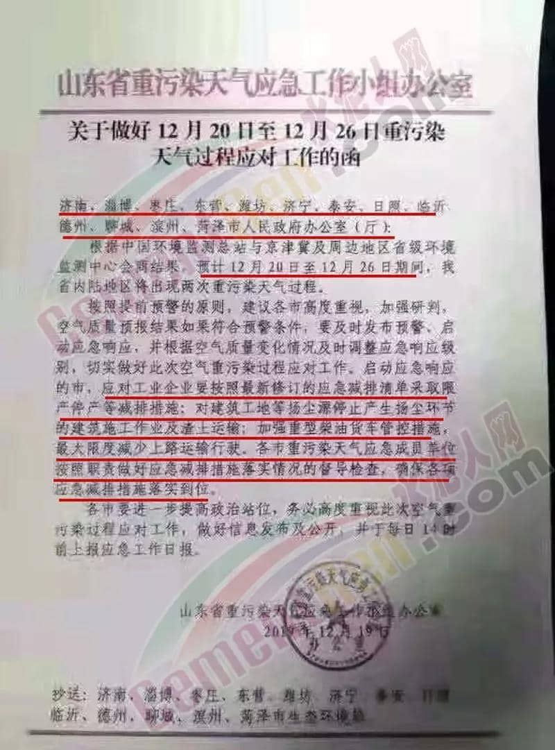 日前,山東省重污染天氣應急工作小組辦公室發《關于做好12月20日至12月26日重污染天氣過程應對工作的函》給濟南、淄博、棗莊、東營、濰坊、濟寧、泰安、日照、臨沂、德州、聊城、濱州、菏澤市等13市稱,根據中國環境監測總站與京津冀及周邊地區省級環境監測中心會商結果,預計12月20日至12月26日期間,山東省內陸地區將出現兩次重污染天氣過程。按照提前預警的原則,建議各市高度重視,加強研判,空氣質量預報結果如果符合預警條件,要及時發布預警,啟動應急響應,并根據空氣質量變化情況及時調整應急響應級別,切實做好此次空氣重污染過程應對工作。啟動應急響應的市,應對工業企業要按照最新修訂的應急減排清單采取限產停產等減排措施;對建筑工地等揚塵源停止產生揚塵環節的建筑施工作業及渣土運輸;加強重型柴油貨車管控措施,最大限度減少上路運輸行駛。各市重污染天氣應急成員單位按照職責做好應急減排措施落實情況的督導檢查,確保各項應急減排措施落實到位。各市要進一步提高政治站位,務必高度重視此次空氣重污染過程應對工作,做好信息發布及公開。文件原文如下: