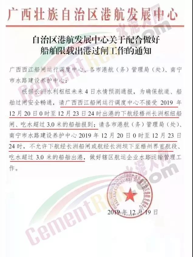 12月19日廣西壯族自治區港航發展中心發布《自治區港航發展中心關于配合做好船舶限載出港過閘工作的通知》稱:根據長洲水利樞紐未來4日水情預測通報,為確保航道、船舶過閘安全暢通,請廣西西江船閘運行調度中心不接受2019年12月20日0時至12月23日24時出港的下航經梧州長洲樞紐船閘、吃水超過3.0米的船舶報到;請各市港航(務)管理局(處)、南寧市水路建設養護中心2019年12月20日0時至12月23日24時,不允許下航經長洲船閘或航經長洲壩下至梧州界首航段、吃水超過3.0米的船舶出港,做好轄區航運企業水路運輸管理工作。