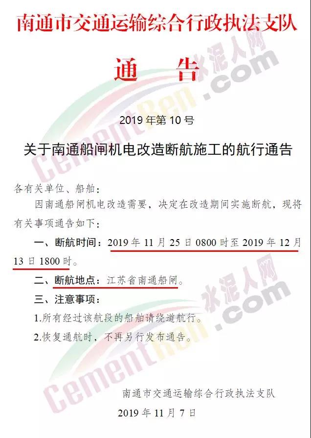 上個月南通市交通運輸綜合行政執法支隊發布《關于南通船閘機電改造斷航施工的航行通告》(2019年第10號)稱因南通船閘機電改造需要,決定在改造期間實施斷航。斷航時間11月25日8時至12月13日18時。斷航地址為江蘇省南通船閘。要求所有經過該航段的船舶繞道航行。