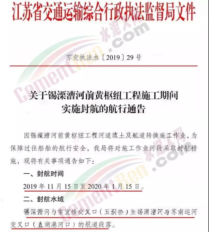 江蘇省交通運輸綜合行政執法監督局發布《關于錫溧漕河前黃樞紐工程施工期間實施封航的航行通告》(蘇交執法水〔2019〕29 號)。錫溧漕河前黃樞紐工程河道填土及航道封航時間為2019 年 11 月 15 日至 2020 年 1 月 15 日。封航水域為錫溧漕河與常宜線交叉口(五洞橋)至錫溧漕河與蘇南運河交叉口(直湖港河口)的航道段落。封航期間途經船舶必須從蕪申運河、丹金溧漕河、京杭運河繞行,同時禁止300噸以上、船寬7米以上的船舶通過武宜運河、老錫溧漕河(太滆運河)繞行。