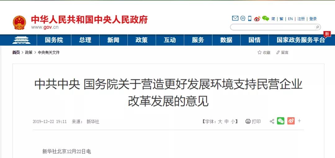 日前,中華人民共和國中央人民政府官網發布《中共中央 國務院關于營造更好發展環境 支持民營企業改革發展的意見》稱:改革開放40多年來,民營企業在推動發展、促進創新、增加就業、改善民生和擴大開放等方面發揮了不可替代的作用。民營經濟已經成為我國公有制為主體多種所有制經濟共同發展的重要組成部分。為進一步激發民營企業活力和創造力,充分發揮民營經濟在推進供給側結構性改革、推動高質量發展、建設現代化經濟體系中的重要作用,現就營造更好發展環境支持民營企業改革發展提出如下意見。