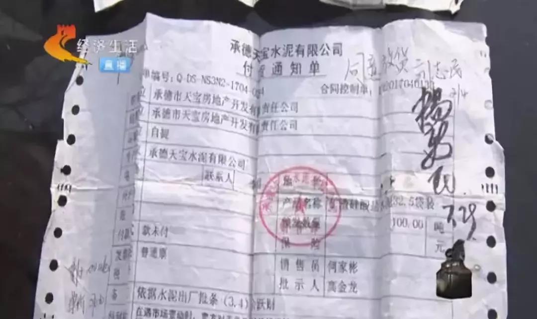 承德寬城滿族自治縣居民楊遠(yuǎn)生口中得知,2017年他以每噸低于市場(chǎng)價(jià)10元,也就是260元/噸的價(jià)格,向承德市天寶房地產(chǎn)開(kāi)發(fā)有限責(zé)任公司,購(gòu)買了400多噸水泥,提貨地點(diǎn)是承德天寶水泥有限公司。2017年當(dāng)年,他憑付貨通知單也就是俗稱的提貨單,提取了200噸左右的現(xiàn)貨,目前,四張票據(jù)當(dāng)中還有205.5噸水泥沒(méi)有提取。