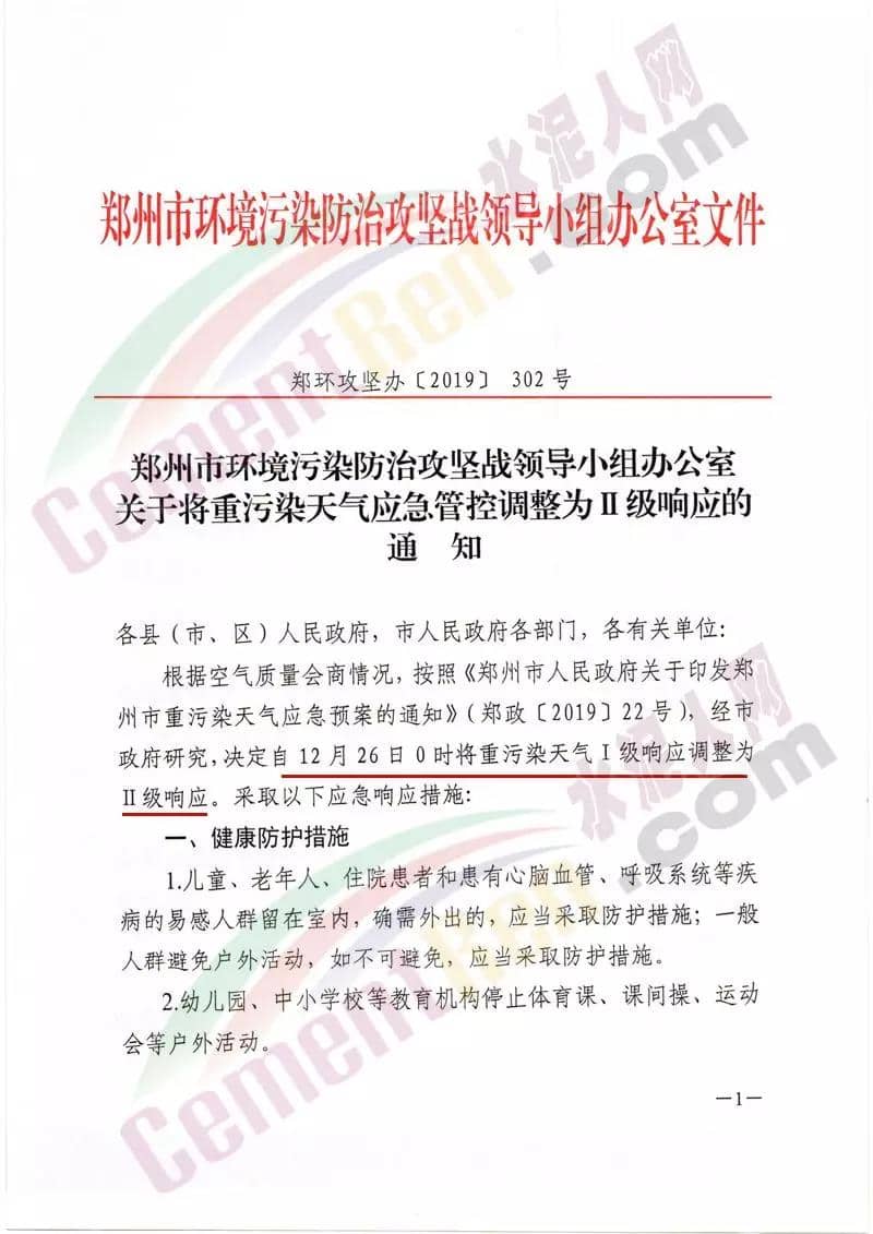 昨日(24日),鄭州市環境污染防治攻堅戰領導小組辦公室印發了《關于將重污染天氣應急管控調整為II級響應的通知》稱,根據空氣質量會商情況,按照《鄭州市人民政府關于印發鄭州市重污染天氣應急預案的通知》(鄭政〔2019〕22號),經市政府研究,決定自12月26日0時將重污染天氣Ⅰ級響應調整為Ⅱ級響應。并提出如下要求:根據鄭州市工業企業重污染天氣應急減排措施橙色管控要求,工業企業按照“一廠一策”實施停產或限產。增加對國、省、市控重點大氣污染源的執法檢查頻次。對大氣污染防治設施不能有效運行的工業企業,依法提請當地政府采取關停措施。豁免及未納入管控的企業污染物排放量較預警前不得上升。應急響應期間處于停爐狀態的工業企業,未經批準不得擅自開爐。全市停止建筑拆除施工,停止開挖、回填、場內倒運、摻拌石灰、混凝土剔鑿等土石方作業, 停止室外電焊、噴涂、粉刷、切割、護坡噴漿等作業(經市政府批準的應急搶險、一類民生工程項目在達標情況下可正常組織施工,二類民生工程項目、綠牌工地可進行除土石方作業外的其他工序作業)。裸露場地應當增加灑水降塵頻次。礦山停止露天作業。砂石料廠、石材廠、石板廠等停止露天作業。露天堆放的散裝物料全部苫蓋,在非冰凍期內增加灑水頻次。全市停止渣土運輸 (經市政府批準的應急搶險工程、一類民生工程項目除外)。全市停止水泥罐車、建筑物料運輸 (經市政府批準的應急搶險、一類民生、二類民生工程、綠牌工地除外)。非道路移動機械(含裝載機、平地機、挖掘機、壓路機、鋪路機、叉車等)停止使用(經批準的允許橙色預警響應期間可以正常生產、施工的企業、工地除外);允許作業的非道路移動機械應達到國三排放標準并粘貼綠色環保標識,或使用電動非道路移動機械。允許運輸的電廠、各類企業、礦山、工地、大型批發市場和物流園區禁止使用國四及以下(含燃氣)重型載貨車輛(特種車輛、危化品車輛除外);在應急響應期間要每日登記所有柴油貨車進出情況,保留視頻監控記錄三個月以上。通知全文如下: