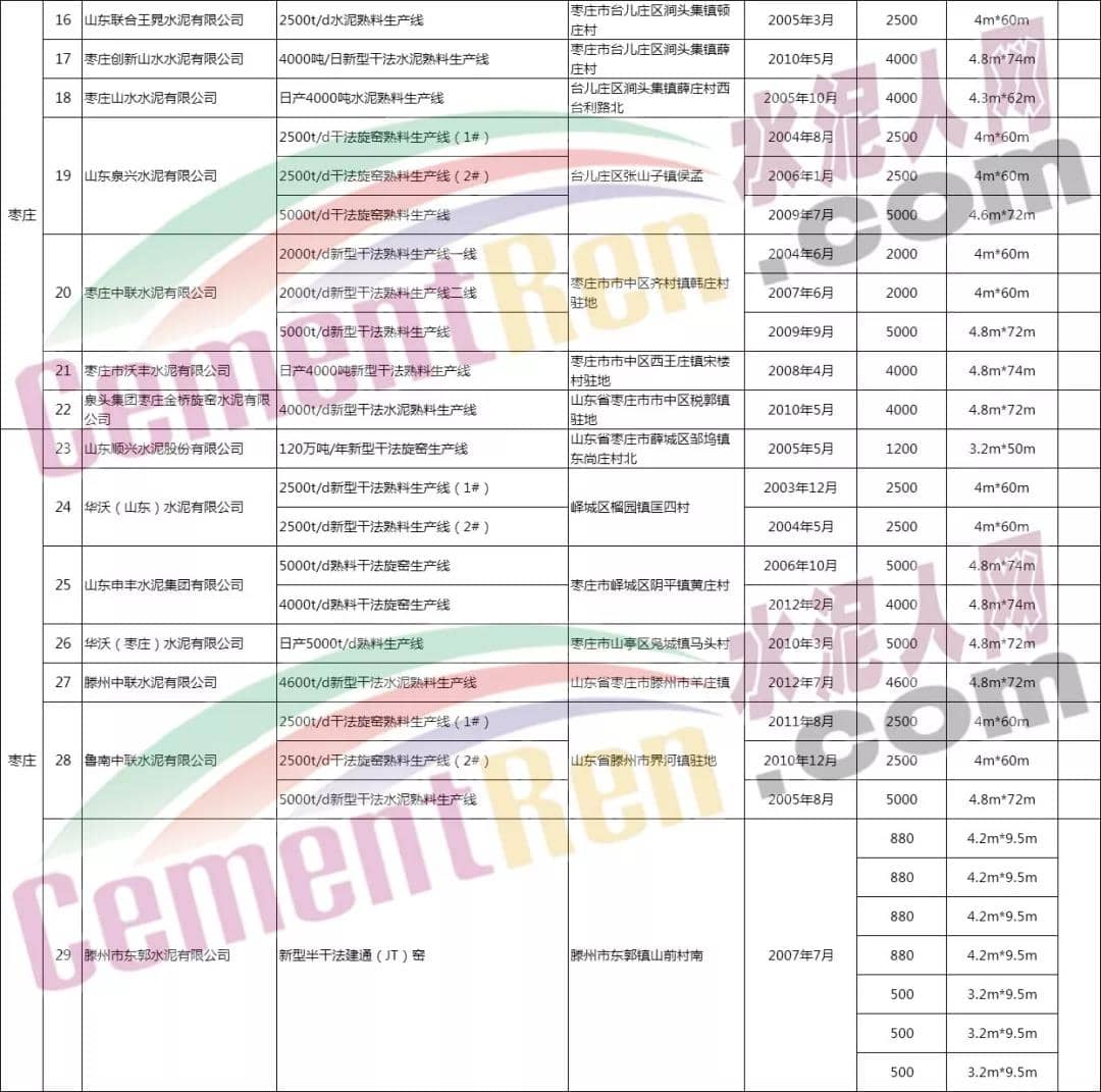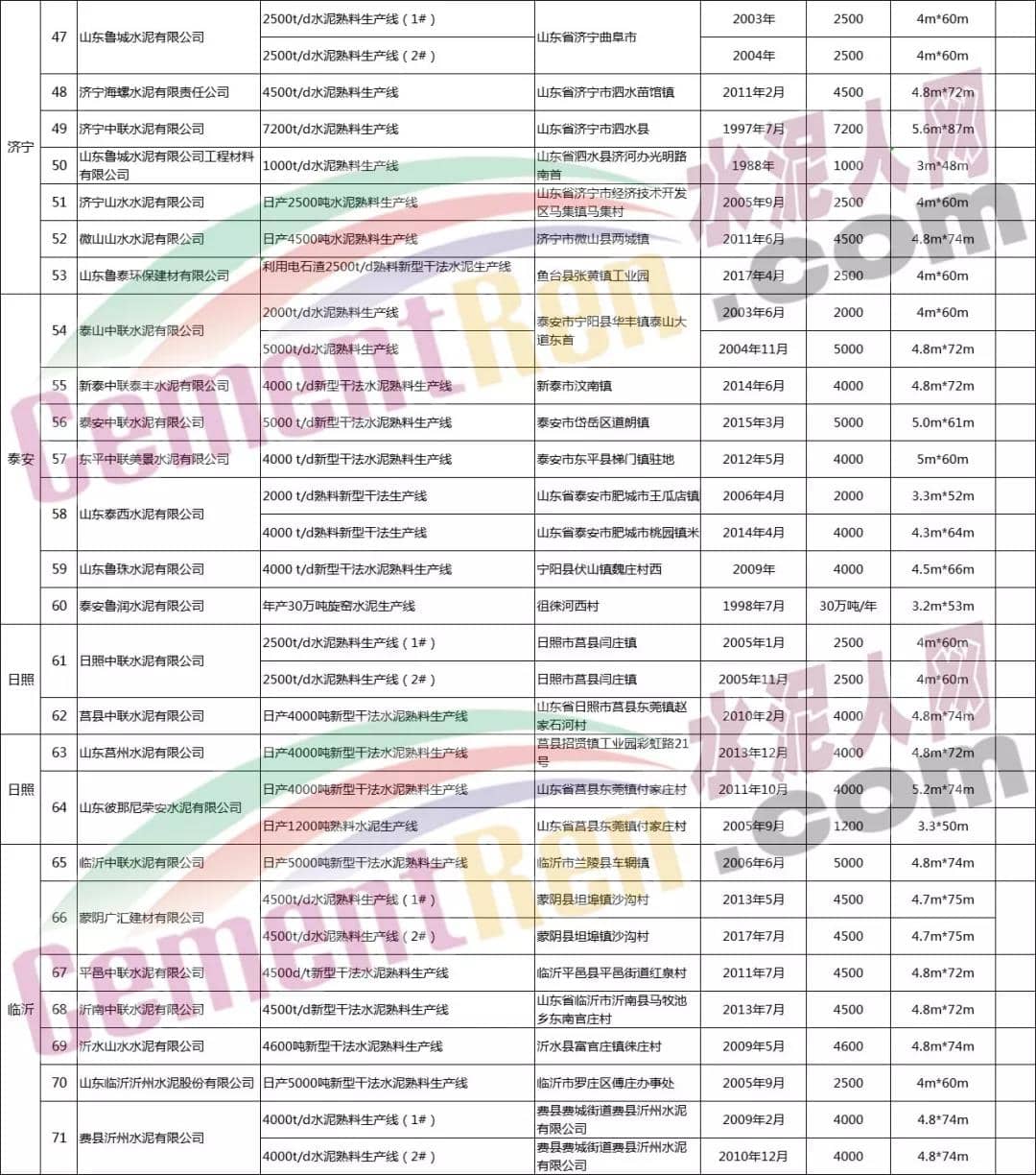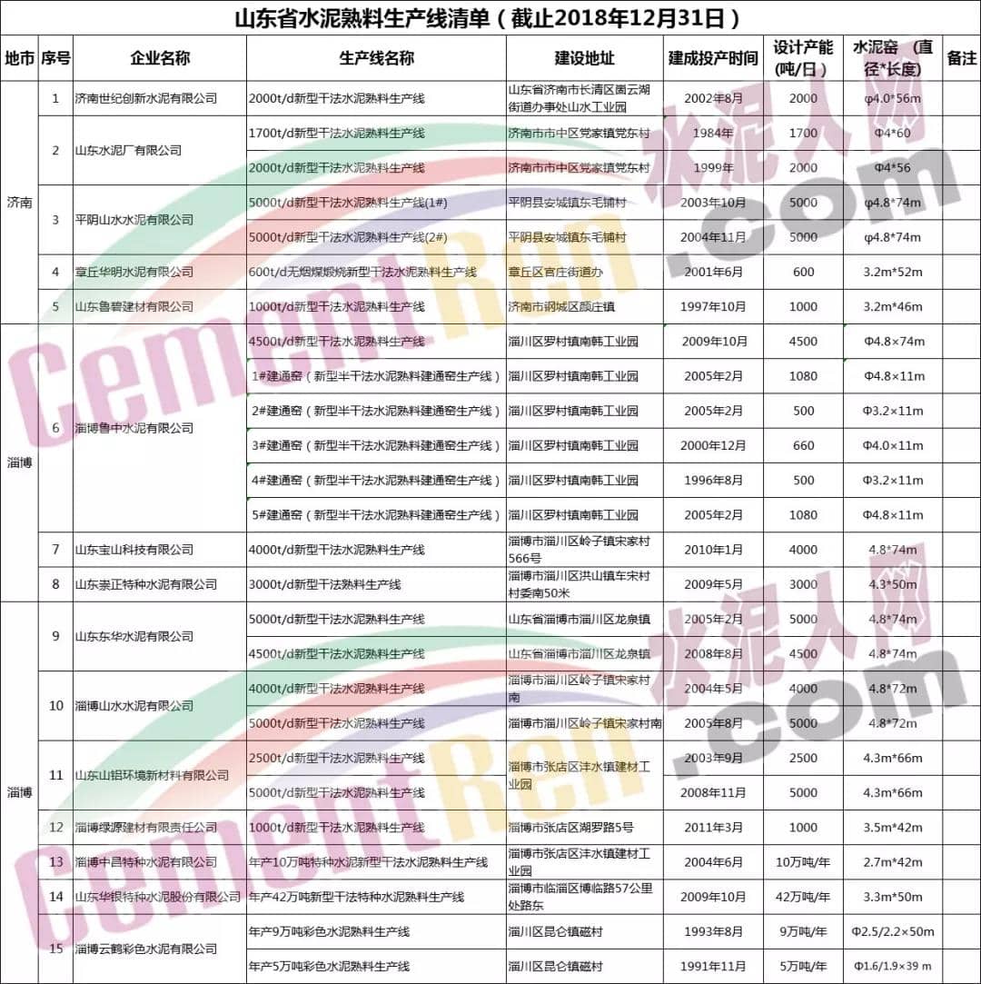 山東省水泥熟料生產線清單如下: