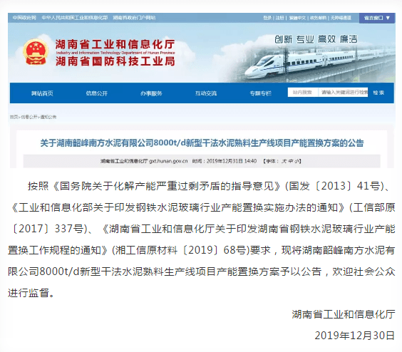 昨日(12月31日),湖南省工業和信息化廳發布了《關于湖南韶峰南方水泥有限公司8000t/d新型干法水泥熟料生產線項目產能置換方案的公告》,原文如下: 產能置換方案如下: 上述方案顯示,湖南韶峰南方水泥有限公司將在湖南省湘潭市湘鄉市棋梓橋鎮擬建一條日產8000噸熟料生產線(Φ5.6×78m回轉窯),擬2020年6月開工,2021年12月投產。