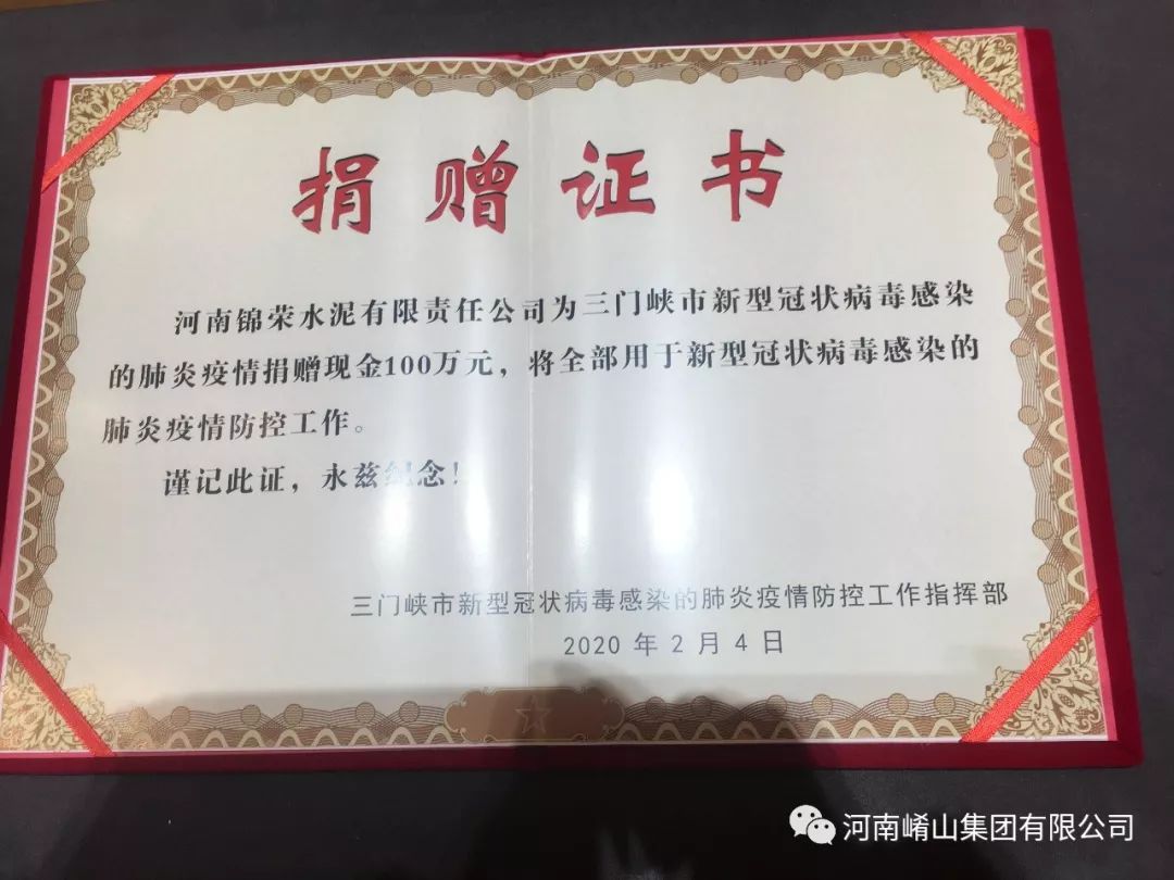 在抓好疫情防控工作的緊要關頭,河南崤山集團所屬企業河南錦榮水泥有限公司積極響應市委、市政府的號召,強化政治覺悟和責任擔當,把疫情防控作為當前壓倒一切的重大政治任務,積極抗擊疫情。2月4日,錦榮公司向三門峽市新型冠狀病毒感染的肺炎疫情防控工作指揮部捐款100萬元,用于抗擊疫情所需的各種緊急物資。