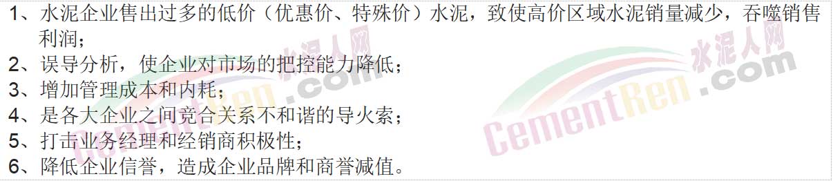 據(jù)多位水泥企業(yè)集團(tuán)銷售總監(jiān)反饋,近年來,由于行業(yè)對錯(cuò)峰生產(chǎn)和重污染天氣預(yù)警疊加執(zhí)行停窯,南北方等各區(qū)域水泥價(jià)格差異較大,跨區(qū)域銷售及“竄貨”銷售嚴(yán)重?cái)_亂正常的市場秩序,頑疾難除,苦不堪言。筆者總結(jié)“竄貨”的禍害主要有: