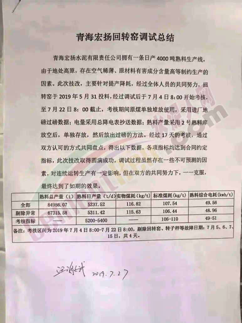 生產部長第一個簽字認可,蔡總已高升為常務副總,全面主持宏揚分公司工作,也是第一時間給予肯定。由于各生產線情況不同,所以針對這次所取得的生產指標:電耗低于50kwh,標煤耗106.5kg,摻加危廢狀態下產量始終保持了5300t/d的水平,在平原上講真的不算什么;但根據當地的地理環境和原材料狀況來看,設計院卻也很客觀的給出了正常產量4200-4300的核算依據。