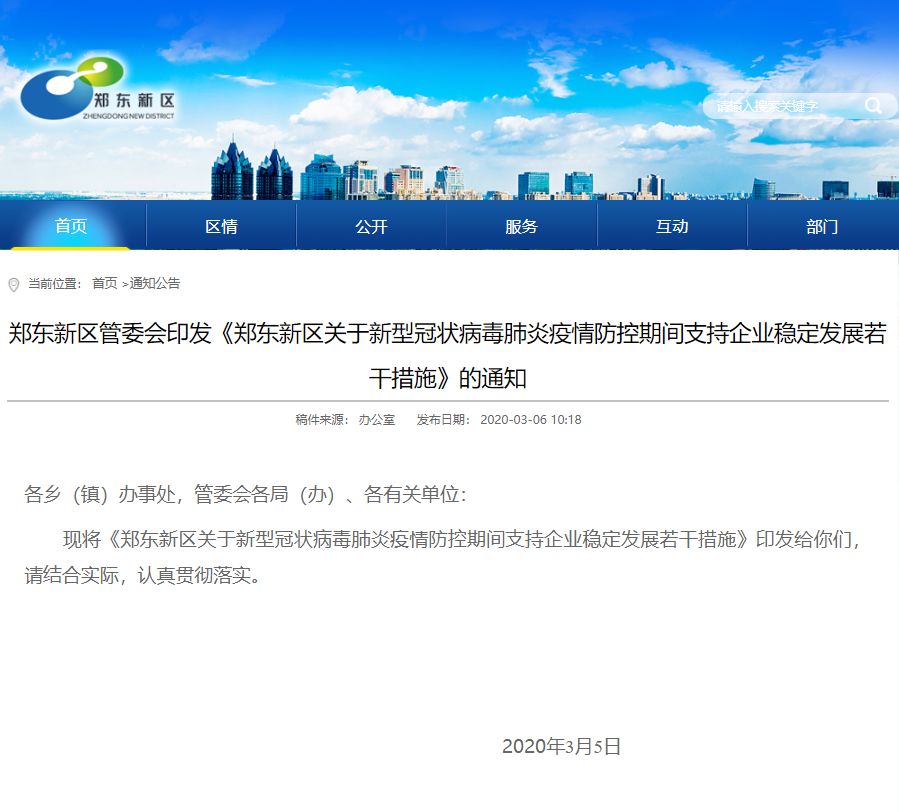 3月6日,河南省鄭州市鄭東新區(qū)管委會印發(fā)《鄭東新區(qū)關于新型冠狀病毒肺炎疫情防控期間支持企業(yè)穩(wěn)定發(fā)展若干措施》的通知 。