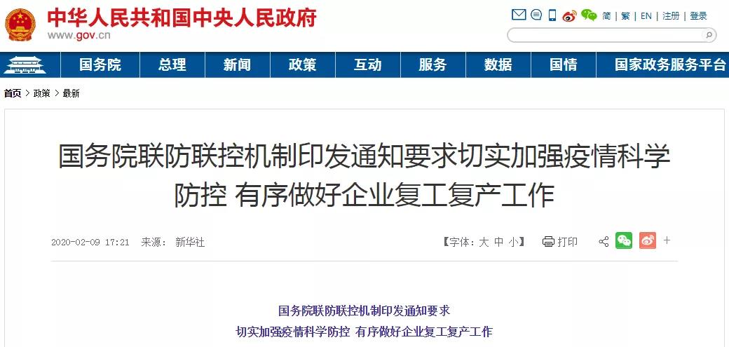 2月8日,國務(wù)院應(yīng)對新型冠狀病毒感染肺炎(以下簡稱“新冠肺炎”)疫情聯(lián)防聯(lián)控機制印發(fā)《關(guān)于切實加強疫情科學防控 有序做好企業(yè)復(fù)工復(fù)產(chǎn)工作的通知》(以下簡稱《通知》)。