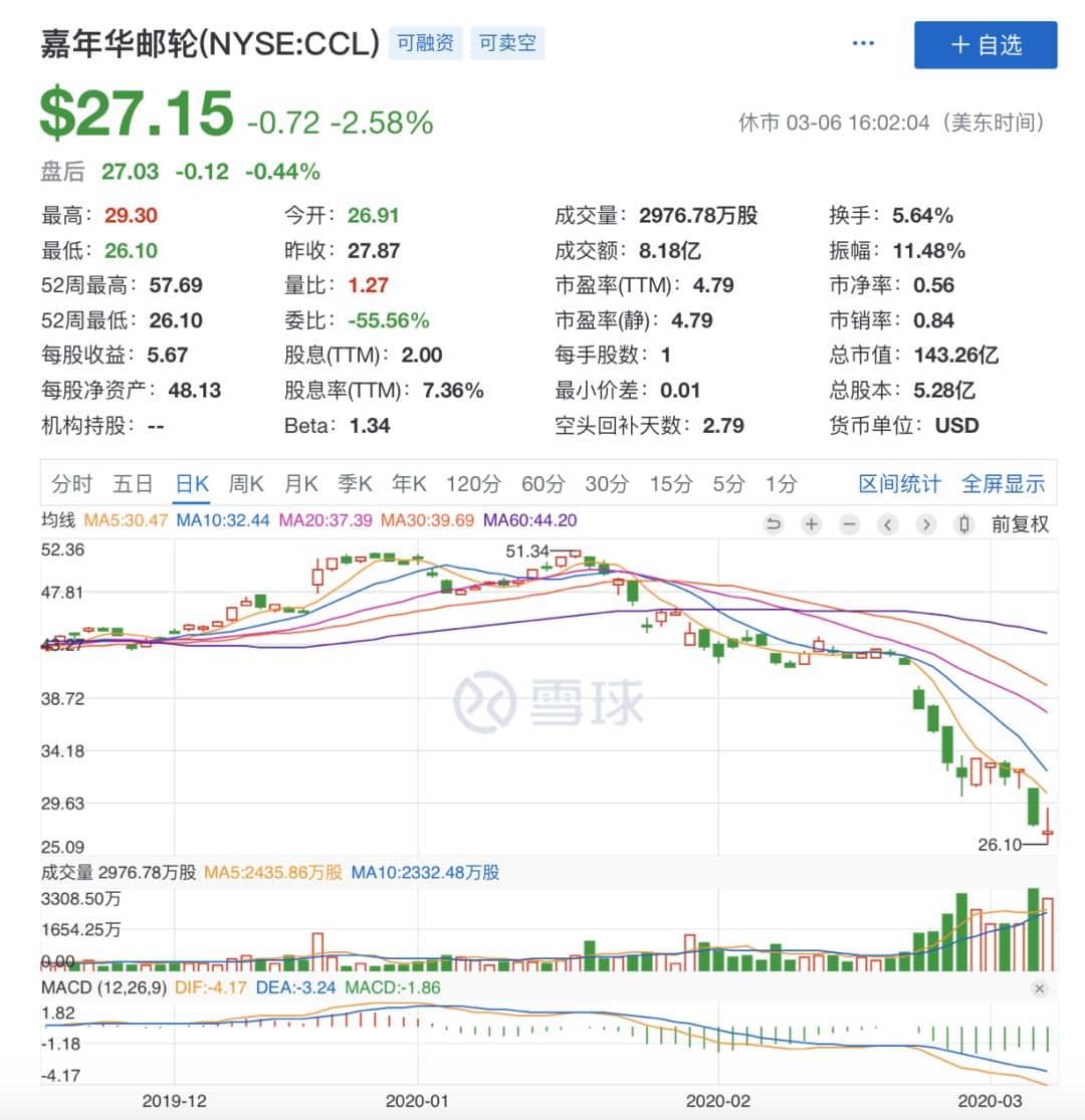由于疫情爆發,嘉年華郵輪也暫停在1月25日-2月4日期間,取消了9條航線,并給乘客全額退款。這對于98%收入來源于船票和輪船上的服務業務的嘉年華郵輪公司來說,一季度的業績已經遭受了部分損失,股價也因此不斷下挫。