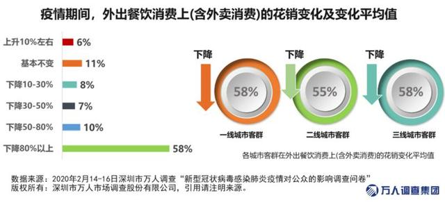 數據顯示,近六成市民表示疫情期間外出餐飲支出下降超過80%。整體來看,一二三線城市的市民在餐飲(含外賣)花銷的降幅較為一致,平均下降比例均在55%-58%之間。