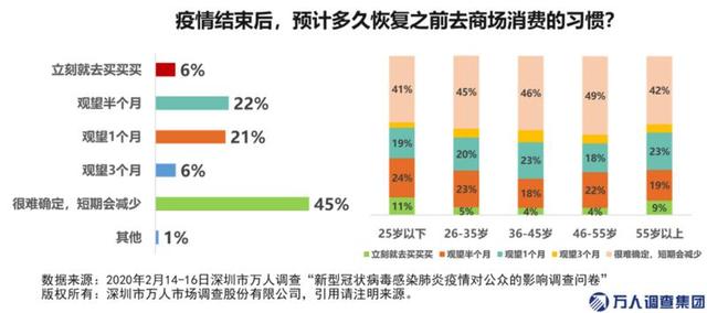 綜合來看,疫情結束后預計1個月內會前往商場的比例達到49.0%,其中立刻前往的占比為6.0%,觀望半個月的比例為21.0%。其中,25歲以下客群最為樂觀,希望立刻就去買買買的比例達11%。