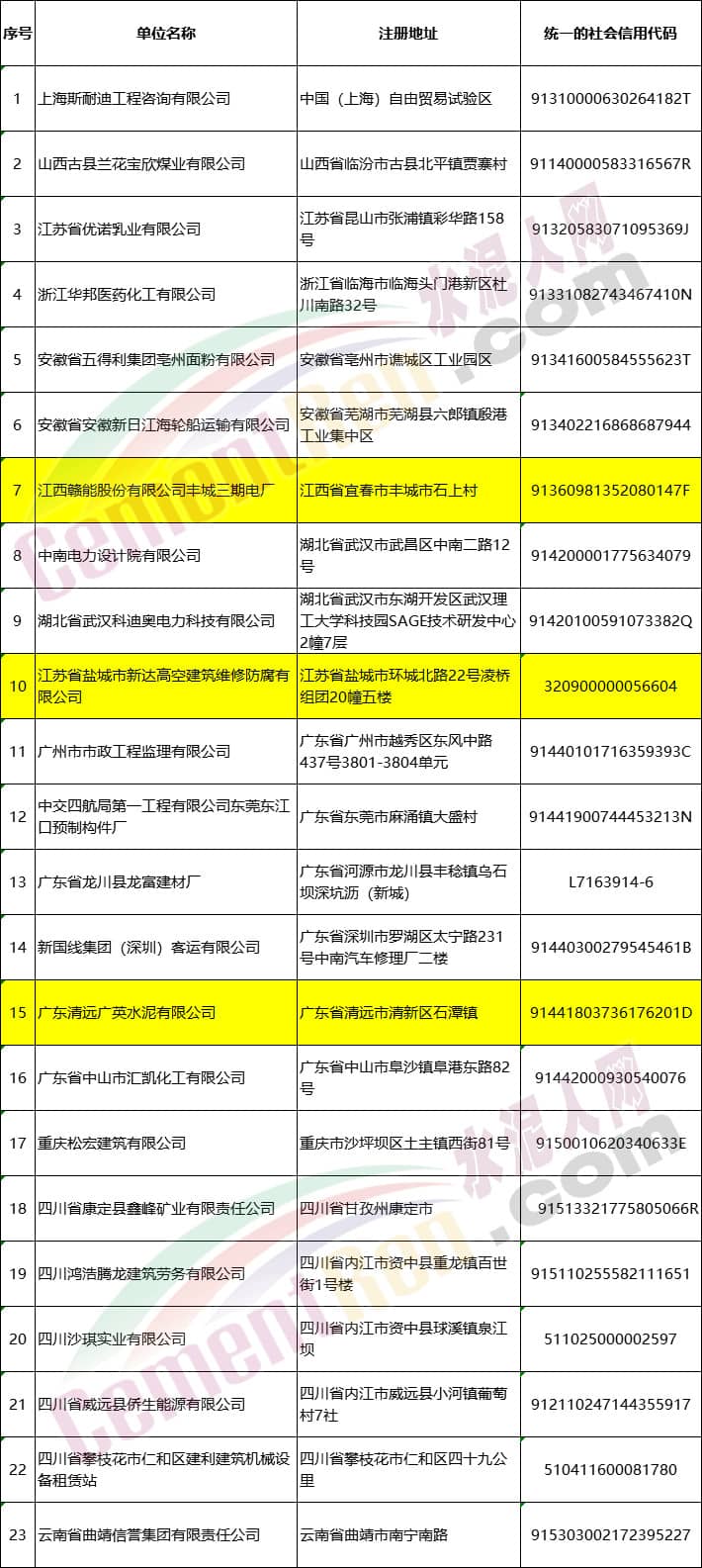 23家移出安全生產(chǎn)失信聯(lián)合懲戒“黑名單”單位名單中包括名單中,包括位于江西省宜春市豐城市石上村的江西贛能股份有限公司豐城三期電廠;位于廣東省清遠(yuǎn)市清新區(qū)石潭鎮(zhèn)廣東清遠(yuǎn)廣英水泥有限公司等企業(yè)。