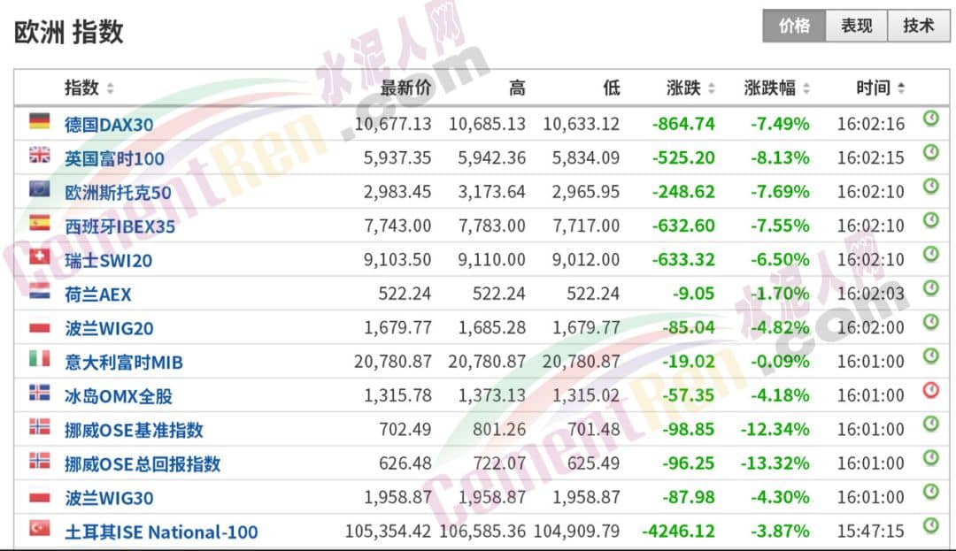 歐美股市也遭遇壓力,歐洲股市開盤全線暴跌,德國DAX指數跌超7%;英國富時100跌超8%;盤前美股標普500、道瓊斯30股指期貨跌幅超4%。