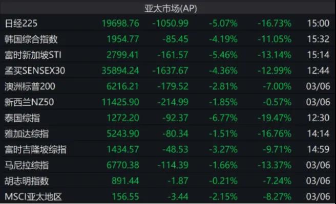 泰國綜指跌超6%,韓國綜合指數跌幅超4%以上。澳大利亞ASX200指數收盤下跌7%。MSCI亞太指數跌4%。由于跌幅猛烈,當天日本東證指數、菲律賓股票指數先后步入了技術性熊市區間。