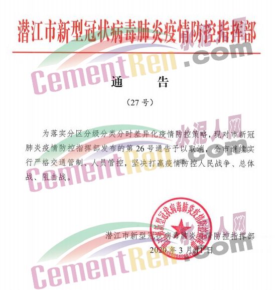 3月11日10時32分潛江市新型冠狀病毒肺炎疫情防控指揮部發布27號通告稱,對市新冠肺炎疫情防控指揮部發布的第26號通告予以取消,全市繼續實行嚴格交通管制、人員管控,堅決打贏疫情防控人民戰爭、總體戰、阻擊戰。