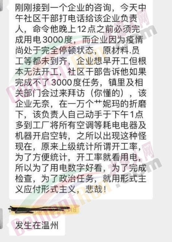 某企業負責人透露:社區干部打電話給該企業負責人,要求他晚上12點之前必須完成3000度電的用電任務,不能打折扣!