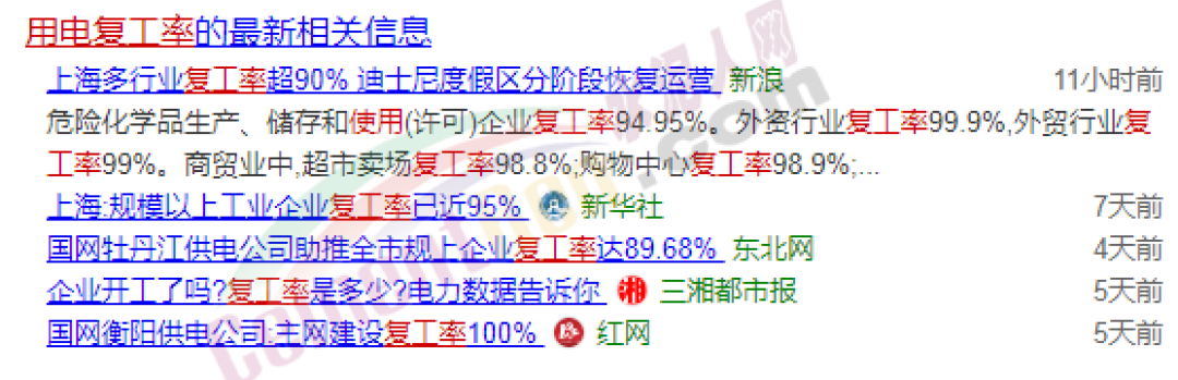 用電量是統計復工率的重要指標。水泥人網搜了一下“用電”、“復工”的新聞,發現各地都有用用電量計算復工率。