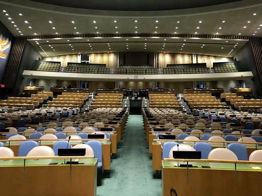 △圖為聯(lián)合國(guó)聯(lián)大會(huì)議廳