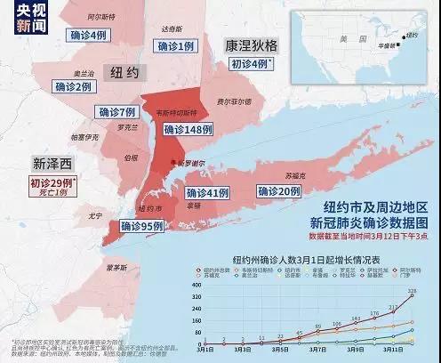 截至3月12日下午3點(diǎn),紐約市新冠肺炎確診人數(shù)已經(jīng)逼近100人,而紐約州新冠肺炎確診人數(shù)已經(jīng)上升到了328人,僅次于華盛頓州。