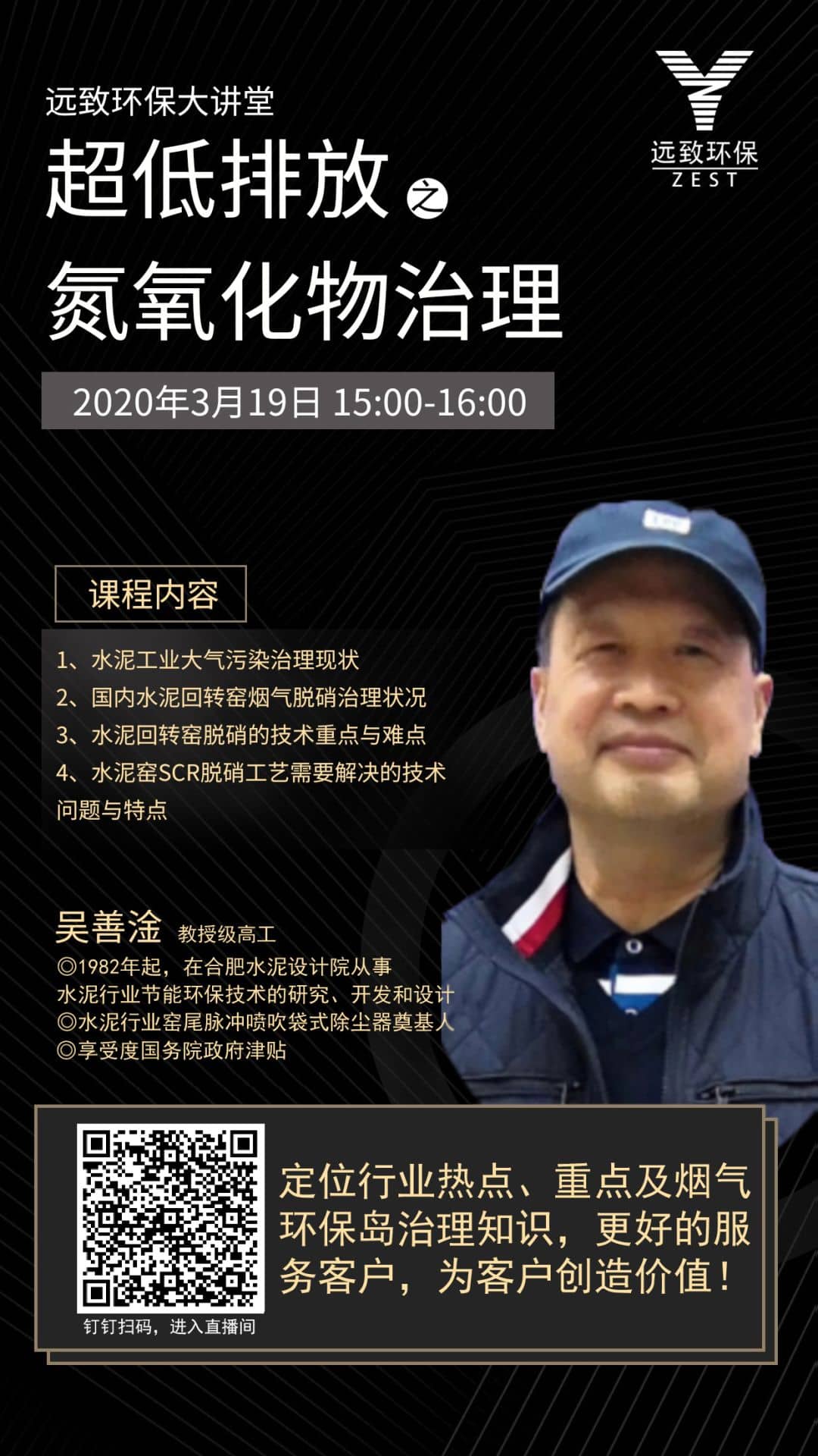 為了讓更多的業(yè)內人士全面的了解水泥工業(yè)大氣污染治,遠致環(huán)保大講堂第一期課程,邀請水泥行業(yè)專家——窯尾脈沖噴突袋式除塵器奠基人吳善淦老師和大家共同探討水泥工業(yè)大氣污染治理現狀、國內水泥回轉窯煙氣脫硝治理狀況、水泥回轉窯脫硝的技術重點與難點、水泥窯SCR脫硝工藝需要解決的技術問題與特點等問題。時間為2020年3月19日15:00~16:00,精彩內容,邀您共享!