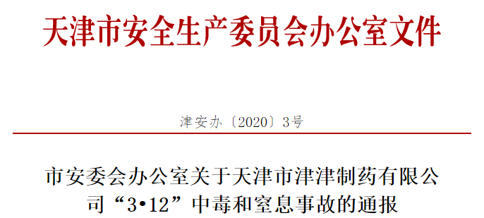 3月17日,天津市安全生產(chǎn)委員會辦公室發(fā)布《關于天津市津津制藥有限公司“3•12”中毒和窒息事故的通報》 稱:事故暴露出該企業(yè)安全意識淡薄,沒有認真吸取同類事故教訓,進入受限空間作業(yè)管理失控等突出問題,以及企業(yè)安全管理混亂、地方監(jiān)管部門受限空間作業(yè)安全專項整治不到位、安全監(jiān)管失之于軟等突出問題。通報原文如下:
