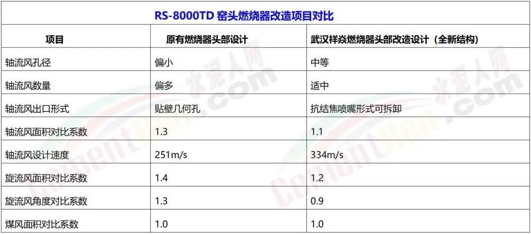 新改造的燃燒器頭部為拉法基歐洲專供機型,此次定項設計RS項目窯頭燃燒器頭部尺寸改造,通過軸流風動能增加軸流風的推力率,以旋流風模式重新設計并修正氣動角度,燃燒器頭部改造后的直接效果,促使更大范圍的高溫煙氣回流及內部氣流的交換速率提升,提高著火能力,強化煅燒,有利于強度,密度,能耗,產量等多方面的優化改善,燃燒器頭部結構也得到優化大幅延長使用周期。