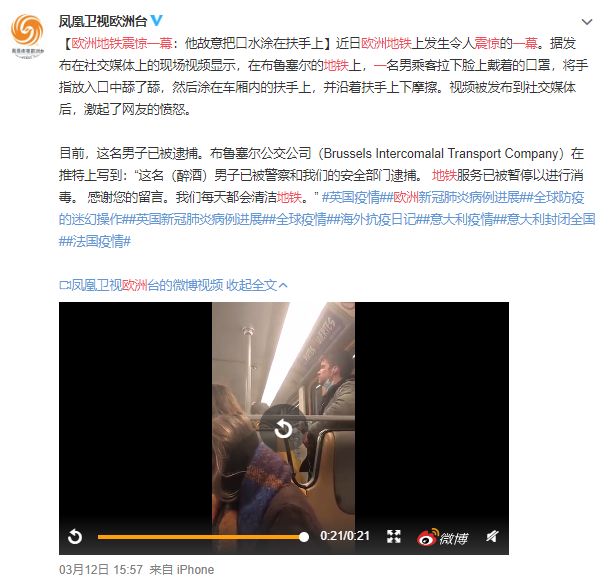 那么真實情況是這樣的嗎?小編認真了解了一下,發現視頻中的事件真實存在,但事發地并不在中國,而是在歐洲。而且在3月12日,鳳凰衛視歐洲臺的官方微博(@鳳凰衛視歐洲臺)已對該事件進行過報道。這令人震驚的一幕發生在布魯塞爾的地鐵上。目前,這名男子已被捕。