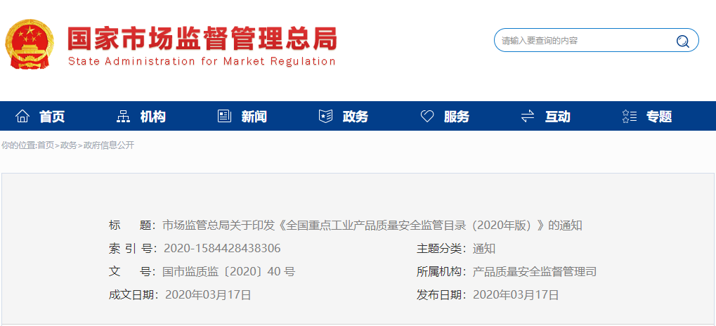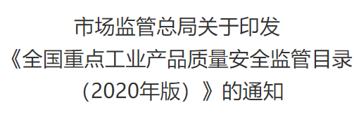 為貫徹落實《質量發展綱要(2011-2020年)》關于“制定實施國家重點監管產品目錄”的要求,市場監管總局在總結《全國重點工業產品質量安全監管目錄(2019年版)》實施經驗,綜合分析監督抽查、生產許可、風險監測、執法打假、國內召回通報、網絡輿情報道等數據,并征集相關單位意見的基礎上,認真分析研究防范疫情工作中反映出的新問題,堅持問題導向,聚焦監督抽查合格率低、各方面反映問題較為突出、涉及重大質量安全或國家有關政策文件要求重點監管的工業產品,制定了《全國重點工業產品質量安全監管目錄(2020年版)》(以下簡稱《目錄》)。現就有關事項通知如下: