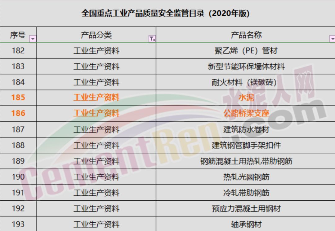 3月17日,國家市場監督管理總局官網發布了《全國重點工業產品質量安全監管目錄(2020年版)》文件,要求抓好流通領域重點產品質量安全監管。特別是針對風險高、已出現區域性或行業性質量安全問題苗頭的產品,要及時開展專項整治,多措并舉、綜合施策、嚴控險情。水泥人網關注到,水泥、鋼筋等重點建筑材料物資位列其中。