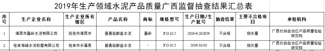 2020年2月17日,廣西市場監管局官網通報2019年共抽查90家企業的166批次產品,其中生產領域抽查159批次,流通領域抽查7批次。經檢驗,合格產品164批次,不合格產品2批次,不合格發現率為1.2%。其中生產領域抽查合格157批次,不合格產品2批次,不合格發現率為1.26%;抽查不合格項目為燒失量。