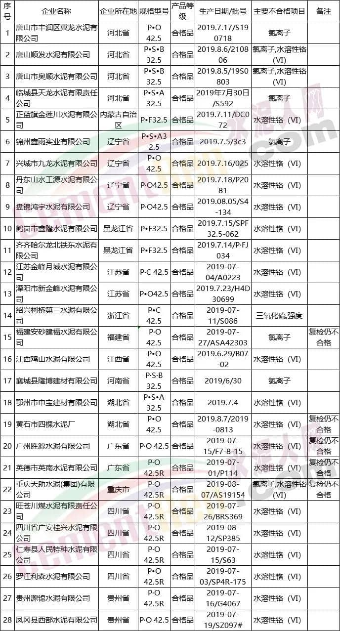 2019年12月市場監管總局辦公廳發布《關于2019年童鞋等51種產品質量國家監督抽查情況的通報》。其中水泥抽查了30個省(區、市)349家企業生產的349批次水泥產品,其中30批次產品不合格,不合格發現率為8.6%。不合格項目涉及三氧化硫、氯離子、強度、水溶性鉻(Ⅵ)。