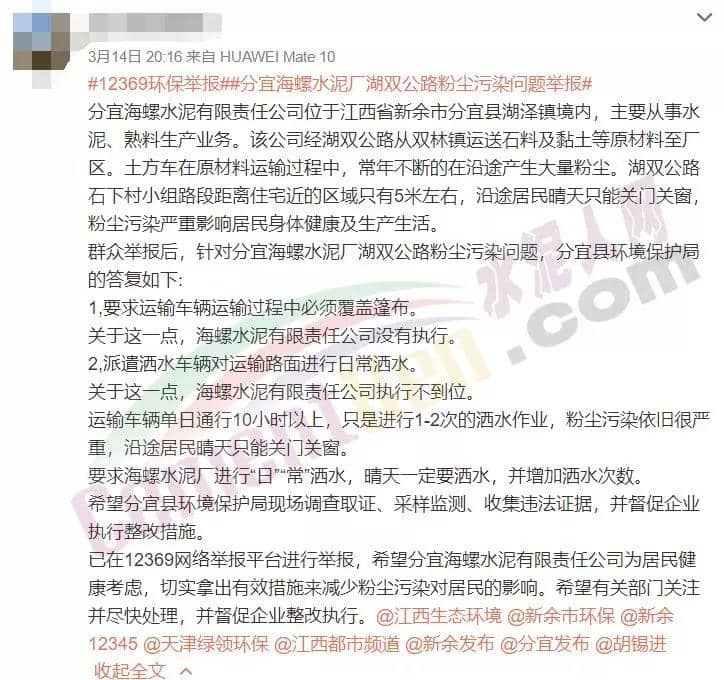 針對分宜海螺水泥廠湖又公路粉塵污染問題,分宜縣環境保護局的答復如下: