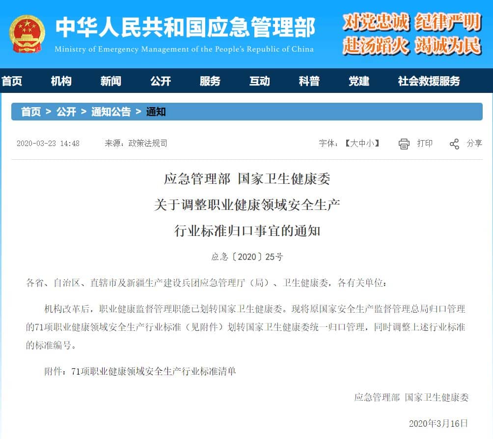 日前應(yīng)應(yīng)急管理部國(guó)家衛(wèi)生健康委聯(lián)合發(fā)布《關(guān)于調(diào)整職業(yè)健康領(lǐng)域安全生產(chǎn)行業(yè)標(biāo)準(zhǔn)歸口事宜的通知》稱:機(jī)構(gòu)改革后,職業(yè)健康監(jiān)督管理職能已劃轉(zhuǎn)國(guó)家衛(wèi)生健康委。現(xiàn)將原國(guó)家安全生產(chǎn)監(jiān)督管理總局歸口管理的71項(xiàng)職業(yè)健康領(lǐng)域安全生產(chǎn)行業(yè)標(biāo)準(zhǔn)(見(jiàn)附件)劃轉(zhuǎn)國(guó)家衛(wèi)生健康委統(tǒng)一歸口管理,同時(shí)調(diào)整上述行業(yè)標(biāo)準(zhǔn)的標(biāo)準(zhǔn)編號(hào)。