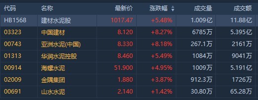 隨著各地陸續復工,西北、華東等地區水泥價格因需求修復率先上漲。青海、寧夏等地區的水泥企業近期將水泥價格上調20元/噸至65元/噸,浙江臺州、溫州等地也將水泥價格上調10元/噸。水泥股全線走強。 截至發稿,中國建材(03323)漲8.27%,報8.12港元;亞洲水泥(中國)(00743)漲8.05%,報8.32港元;華潤水泥控股(01313)漲5.36%,報8.46港元;海螺水泥(600585,股吧)(00914)漲4.95%,報51.9港元。