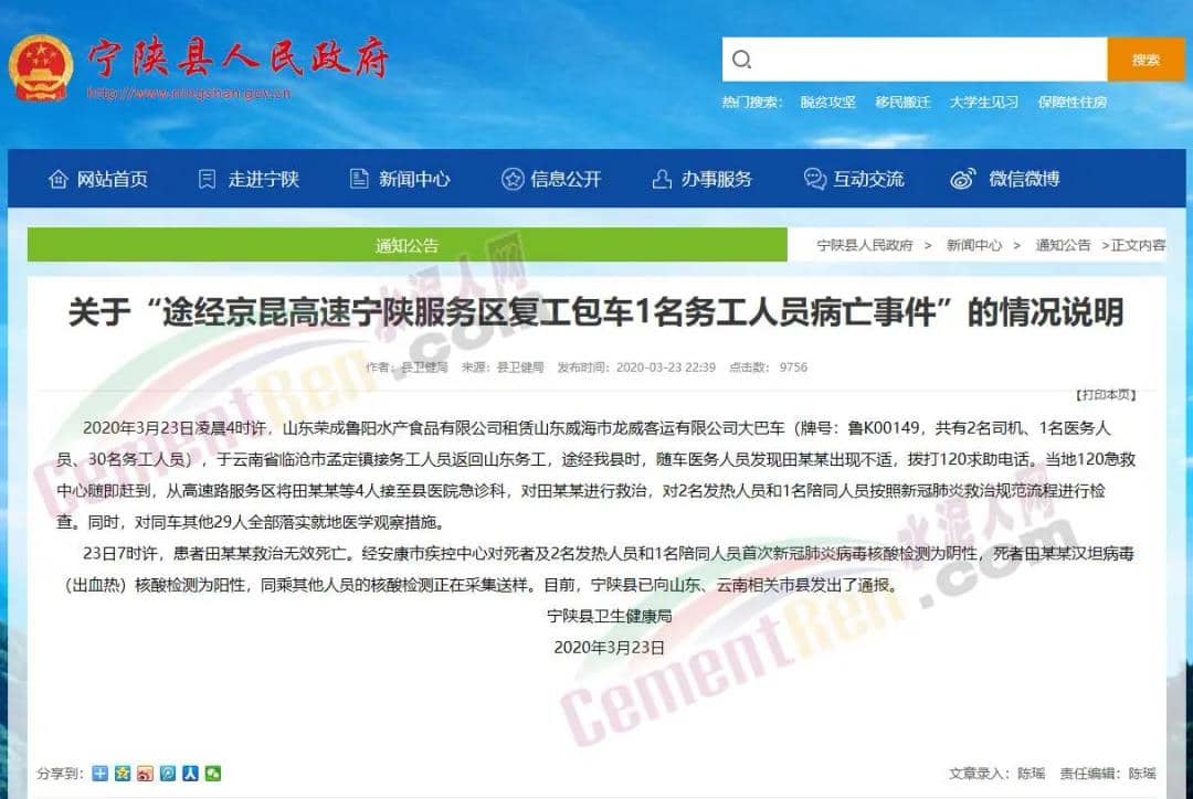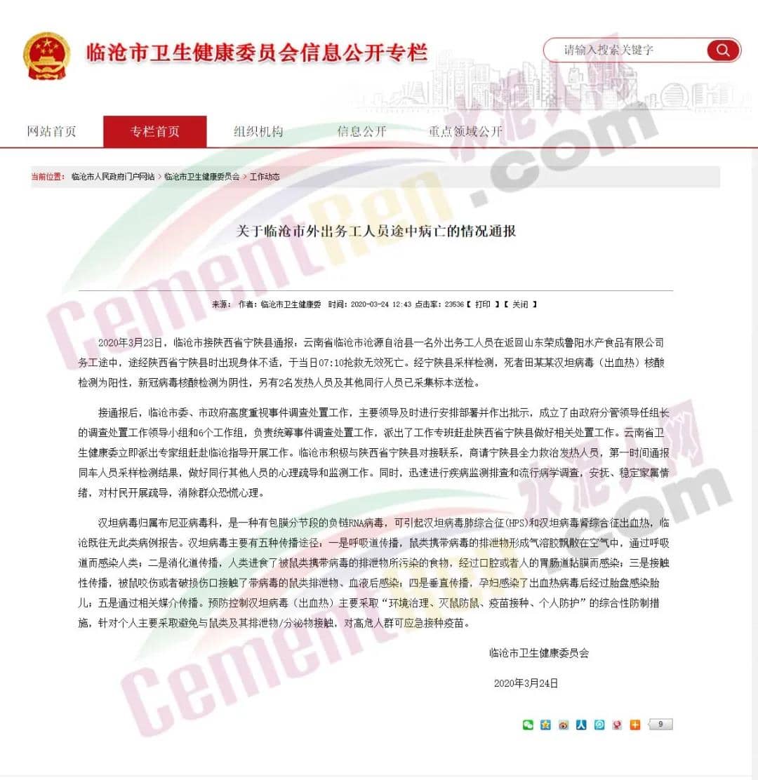 3月24日云南臨滄市健康委員會發布《關于臨滄市外出務工人員途中病亡情況的通報》稱,云南省臨滄市滄源自治縣一名外出務工人員在返回山東榮成魯陽水產食品有限公司務工途中,途經陜西省寧陜縣時出現身體不適,于當日07:10搶救無效死亡。經寧陜縣采樣檢測,死者田某某漢坦病毒(出血熱)核酸檢測為陽性,新冠病毒核酸檢測為陰性,另有2名發熱人員及其他同行人員已采集標本送檢。