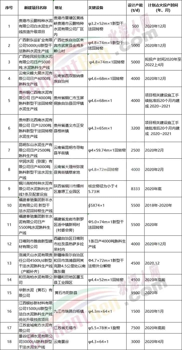 一、2020年準備投產的產能(18條生產線合計產能約2460.99萬噸/年)
