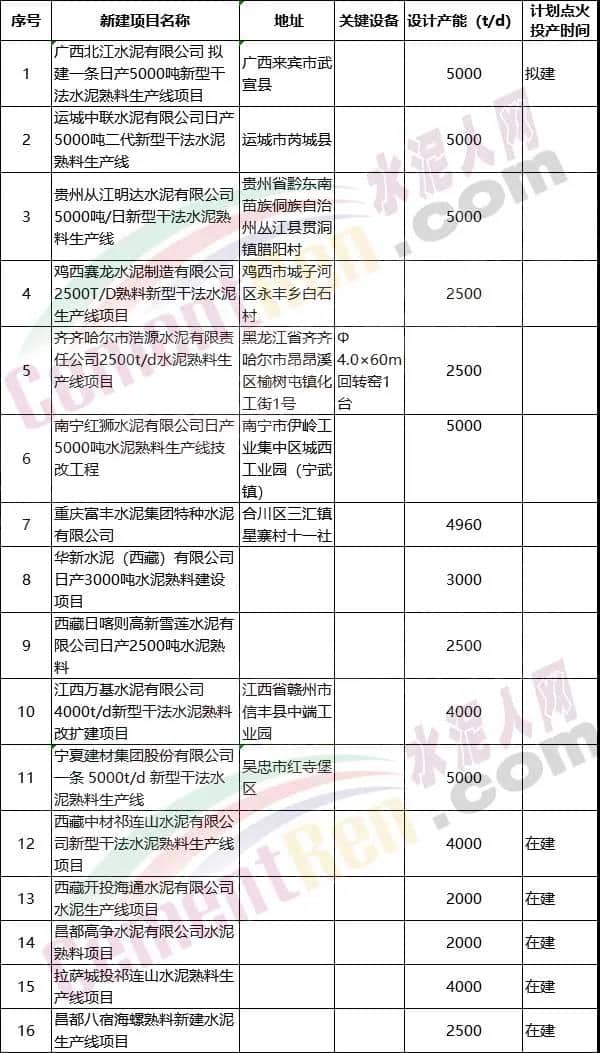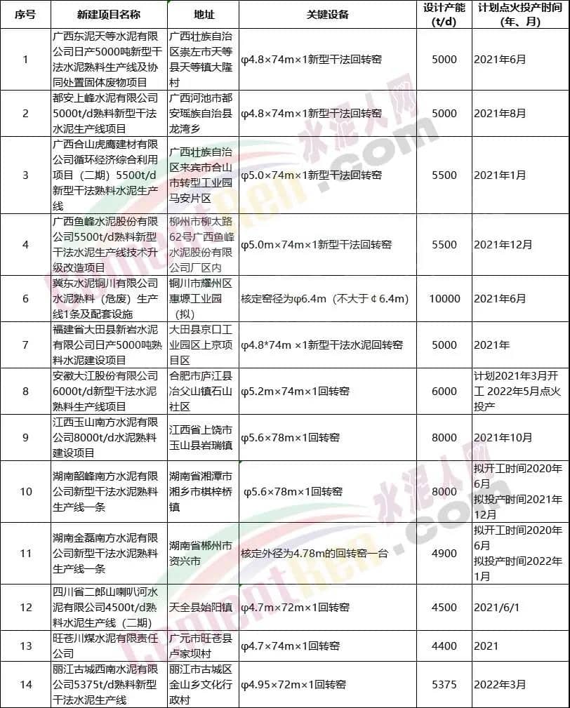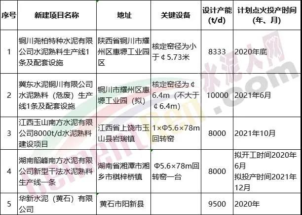 近日,寧夏建材在回復投資者提問時表示,位于寧夏吳忠市的紅寺堡5000t/d生產線將于2020年下半年投產;同期,江西玉山縣發布了江西玉山南方優化升級8000t/d熟料水泥生產線,預計2020年12月建成投產;江西萬年青水泥股份有限公司萬年水泥廠,計劃投資21.78億元,將建設新型干法熟料水泥生產線,打造全系統智能化、綠色低碳水泥示范生產線。近三年各地新建產能將“百花齊放”。