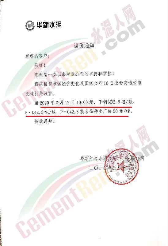 春江水泥通知水泥價格下調20元/噸。