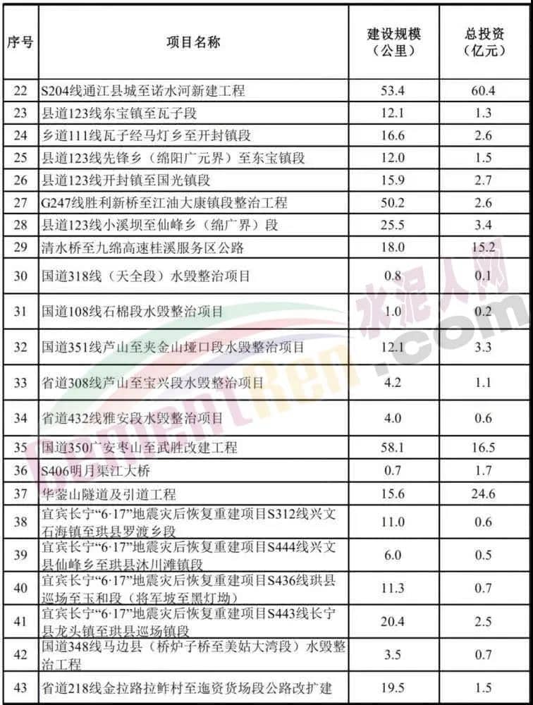 2、促進五區協同發展,強化路網互聯互通,如天府新區至邛崍、古藺至金沙等2個高速公路(81公里、195億元)、S204線通江縣城至諾水河等21個國省干線(241公里、92億元);