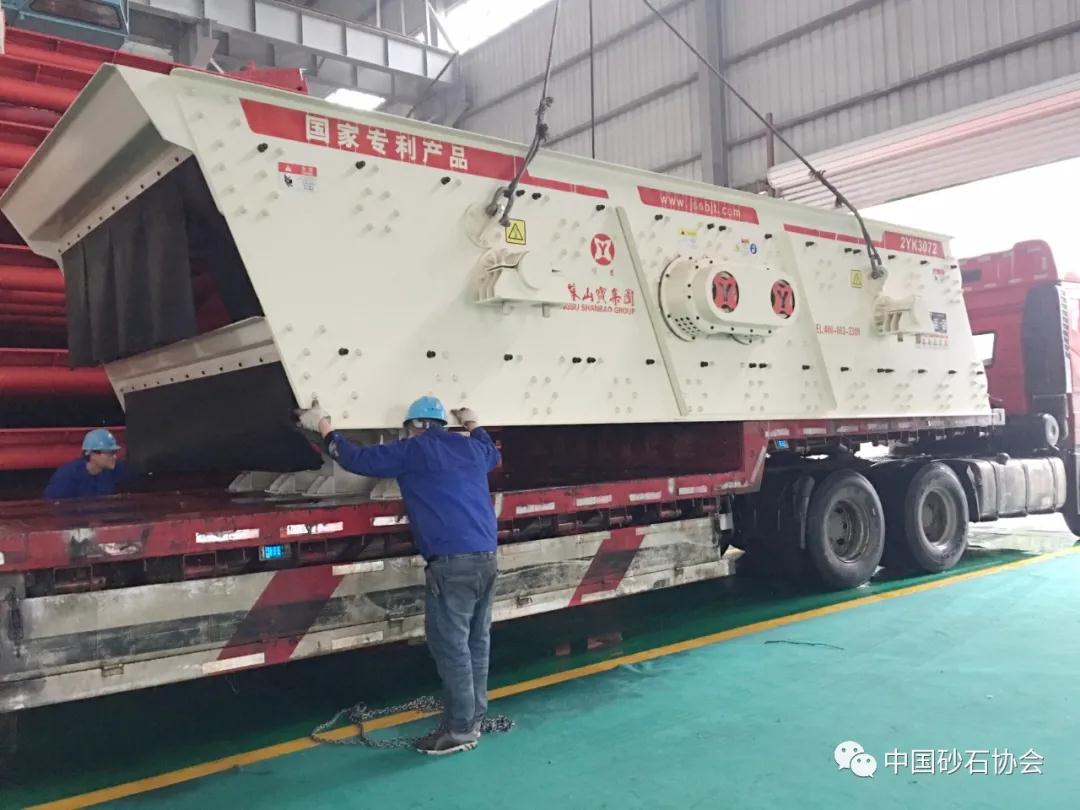 2020年3月26日,江蘇山寶集團廠區內,工人們正有條不紊地進行著YK系列圓振動篩的吊裝工作,起吊、平移、穩落、固定,每一個環節都認真而細致,確保設備安全抵達現場,助力全椒海螺水泥骨料篩分項目。
