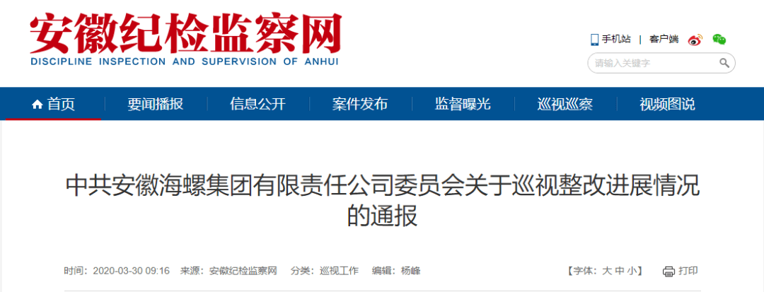 日前,安徽紀檢監察網發布《中共安徽海螺集團有限責任公司委員會關于巡視整改進展情況的通報》文件稱:根據安徽省委統一部署,2019年5月20日至7月10日,安徽省委第三巡視組對海螺集團公司開展了巡視。2019年8月7日,省委巡視組向海螺集團公司反饋了巡視意見。全文如下: